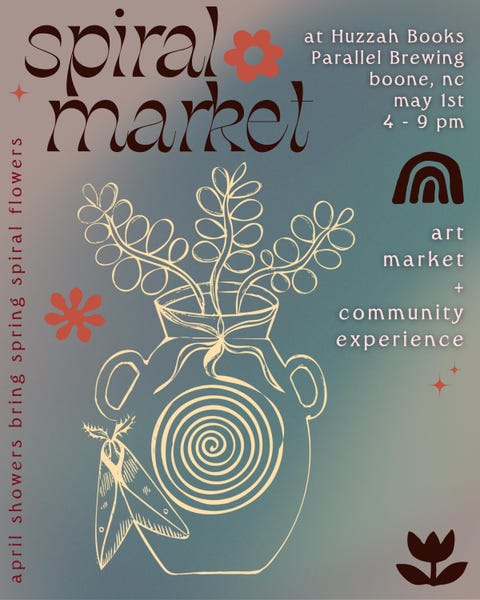 Spiral Art Market is a diverse and eclectic artisan market highlighting various makers and artisans from the Western North Carolina region. Featuring fine art vendors, craftspeople, vintage sellers and artists, this evening market is a great chance to shop local makers, enjoy live music, and browse unique and original one-of-a-kind work!